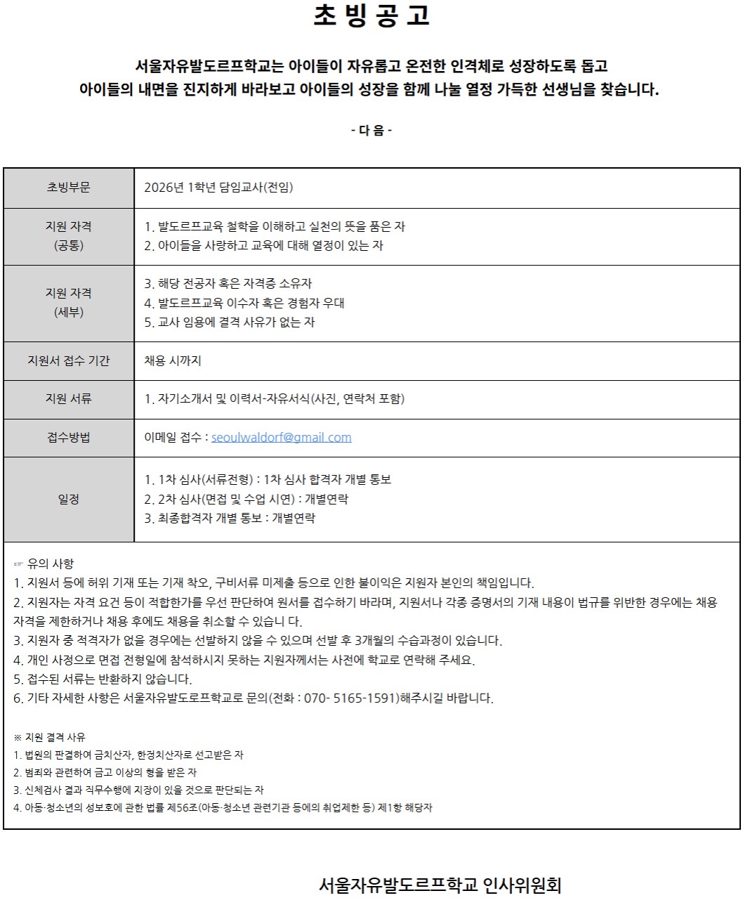 서울자유발도르프학교에서 2026년 1학년 담임교사를 초빙합니다.